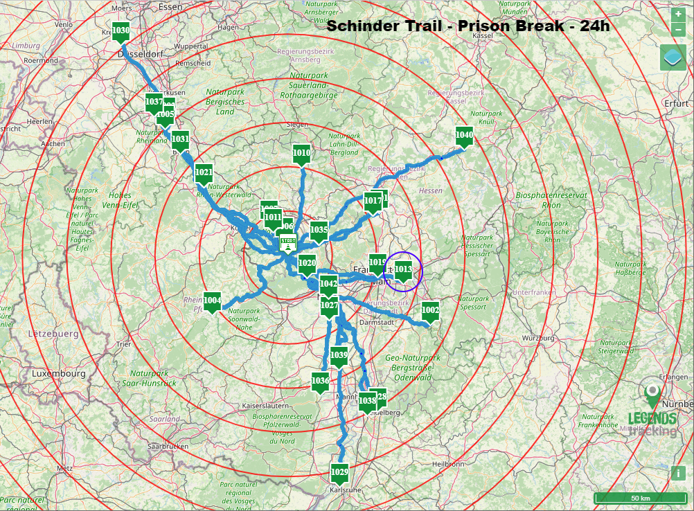 Bereits nach wenigen Minuten teilt sich die Läuferschar auf und jeder folgt seinem persönlichen Fluchtweg. Ein jüngerer Mitgefangener bleibt jedoch bei mir. Er hat keinen Track vorbereitet und so beschließen wir, gemeinsam bis nach Wiesbaden zu laufen, wo er dann den Rhein überqueren und sich allein weiter durchschlagen will.